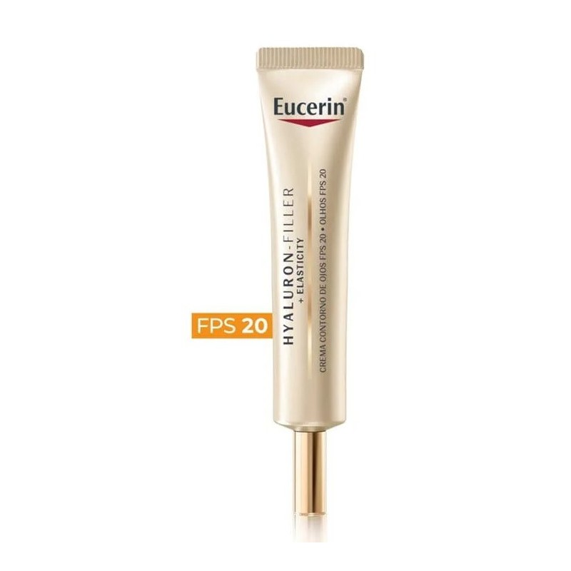 Eucerin Hyaluron-Filler + Elasticity Contorno de Ojos es una crema antiedad para piel madura que rellena arrugas profundas, mejora la elasticidad y suaviza las ojeras. Formulada con Ácido Hialurónico, Arctiina y Collagen-Elastin Complex, aporta una mirada más firme, luminosa y rejuvenecida. Con FPS 20 y filtros UVA/UVB, protege frente al envejecimiento solar. Sin perfume y apta para pieles sensibles.