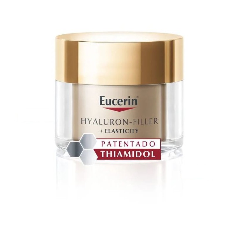 Eucerin Hyaluron-Filler + Elasticity Noche es una crema de noche antiedad formulada para pieles maduras. Su acción está destinada a reducir las arrugas profundas, mejorar la elasticidad de la piel y combatir las manchas de la edad. Gracias a su combinación exclusiva de ingredientes, hidrata intensamente y favorece la regeneración cutánea durante la noche.