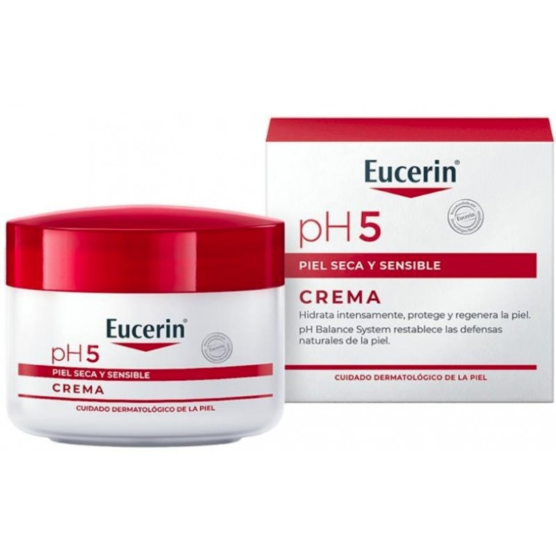 Eucerin pH5 Crema Piel Sensible y Seca es una crema facial y corporal diseñada para piel sensible y seca. Proporciona hidratación duradera, absorción rápida y fortalece las defensas naturales de la piel. Con dexpantenol y Citrate Buffer, protege, suaviza y mantiene la piel equilibrada y confortable.