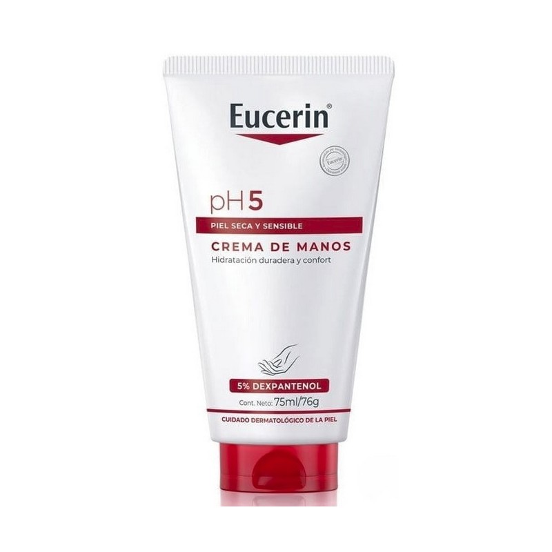 Eucerin pH5 Crema de Manos es una crema reparadora e hidratante especialmente formulada para el cuidado de las manos sensibles, secas o dañadas por el lavado frecuente, los agentes externos o el uso de productos químicos. Gracias a su exclusiva fórmula con dexpantenol al 5% y el innovador Sistema pH Balance con pH5 Citrate Buffer, esta crema actúa reforzando la barrera natural de la piel, aportando una hidratación profunda, protección duradera y sensación inmediata de confort.