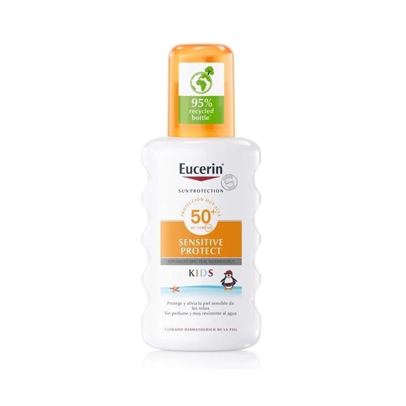 Eucerin Sun Kids Sensitive Protect Spray FPS 50+ es un protector solar avanzado en spray para niños diseñado específicamente para calmar y proteger la piel sensible infantil. Gracias a su Advanced Spectral Technology, ofrece una protección muy alta frente a los rayos UVA y UVB y también frente a la luz visible de alta energía (HEVL), ayudando a prevenir el daño cutáneo a largo plazo. Su fórmula, sin fragancias y extra resistente al agua, incluye ácido glicirretínico que estimula la reparación del ADN de la piel y licocalcón A que neutraliza los radicales libres producidos por la exposición solar.