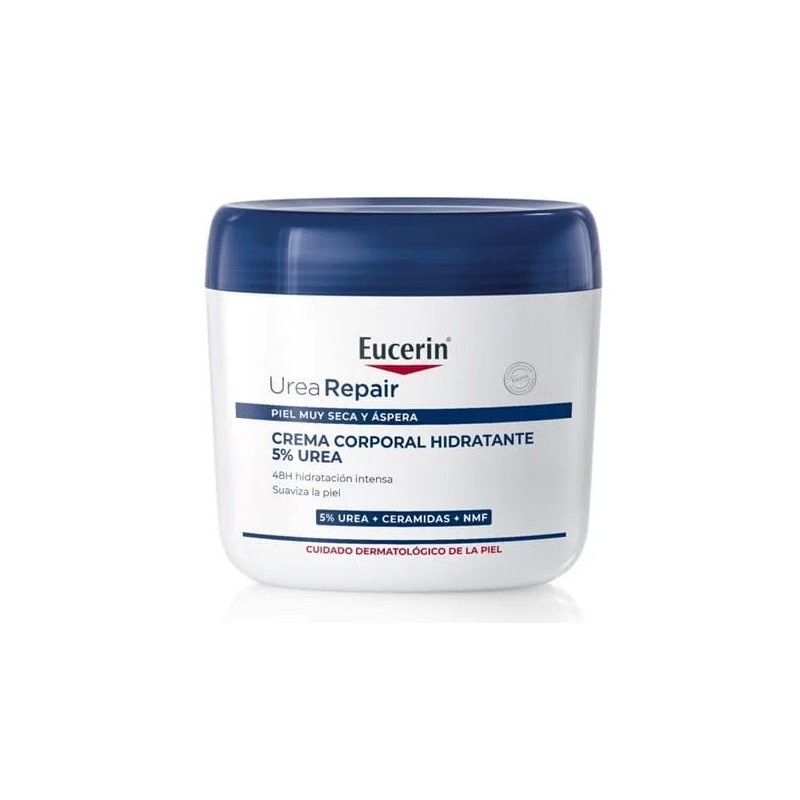 Eucerin UreaRepair Crema Corporal Hidratante 5 % Urea es una crema intensiva para piel seca y áspera, que proporciona hidratación 48 h, suavidad y protección. Contiene urea, ceramidas y factores naturales de hidratación, reforzando la barrera cutánea y aliviando la sequedad. Ideal para piel sensible, con psoriasis o diabetes.
