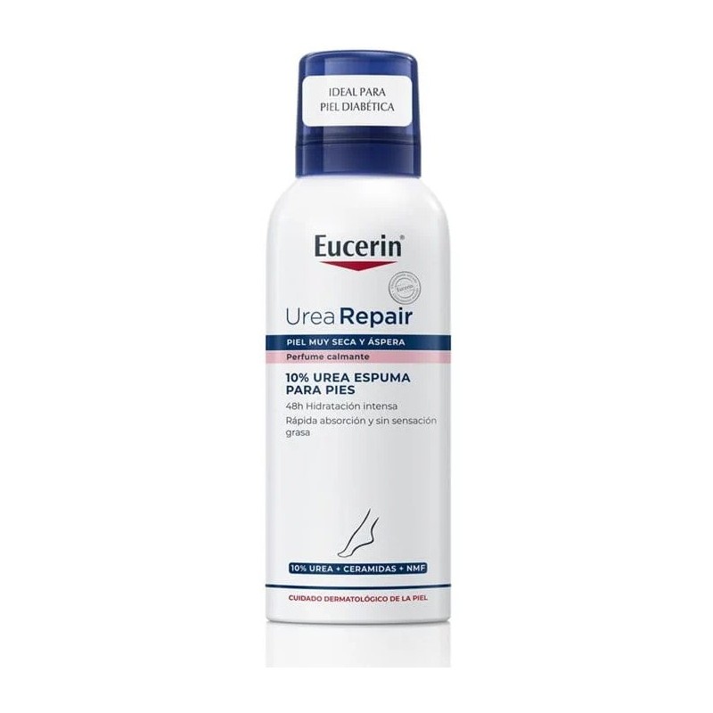 Eucerin UreaRepair Espuma para Pies 10% Urea es un tratamiento avanzado para pies secos y ásperos, formulado con 10% de urea, ceramidas, factores naturales de hidratación, dexpantenol y decanediol. Esta espuma ultraligera proporciona hidratación intensiva durante 48 horas, alivia la piel seca de manera inmediata y deja un acabado no graso, de rápida absorción. Su perfume suave ha sido especialmente desarrollado para la piel seca y sensible, evitando la irritación que algunos productos perfumados pueden causar. Eucerin UreaRepair Espuma para Pies 10% Urea es clínicamente y dermatológicamente probado, siendo ideal para personas con piel envejecida, xerosis, psoriasis o diabetes.