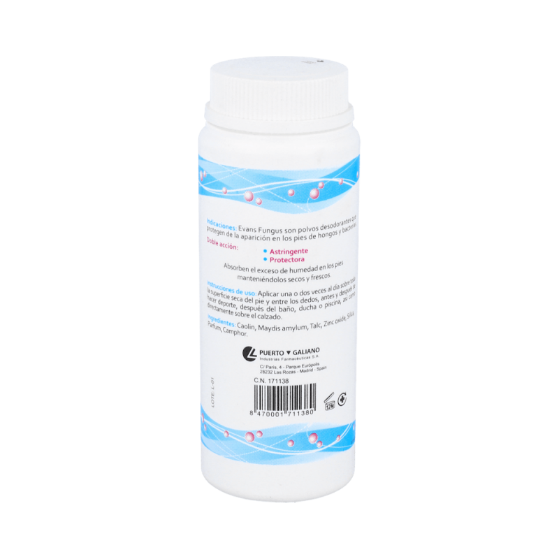 Evans Fungus Polvos Pédicos es la solución ideal para quienes buscan mantener sus pies secos, protegidos y frescos. Su fórmula única combina ingredientes naturales y eficaces que no solo eliminan el exceso de humedad, sino que también previenen los hongos y neutralizan los malos olores. Su uso diario garantiza pies saludables y cómodos, permitiéndole disfrutar de su día con confianza.
