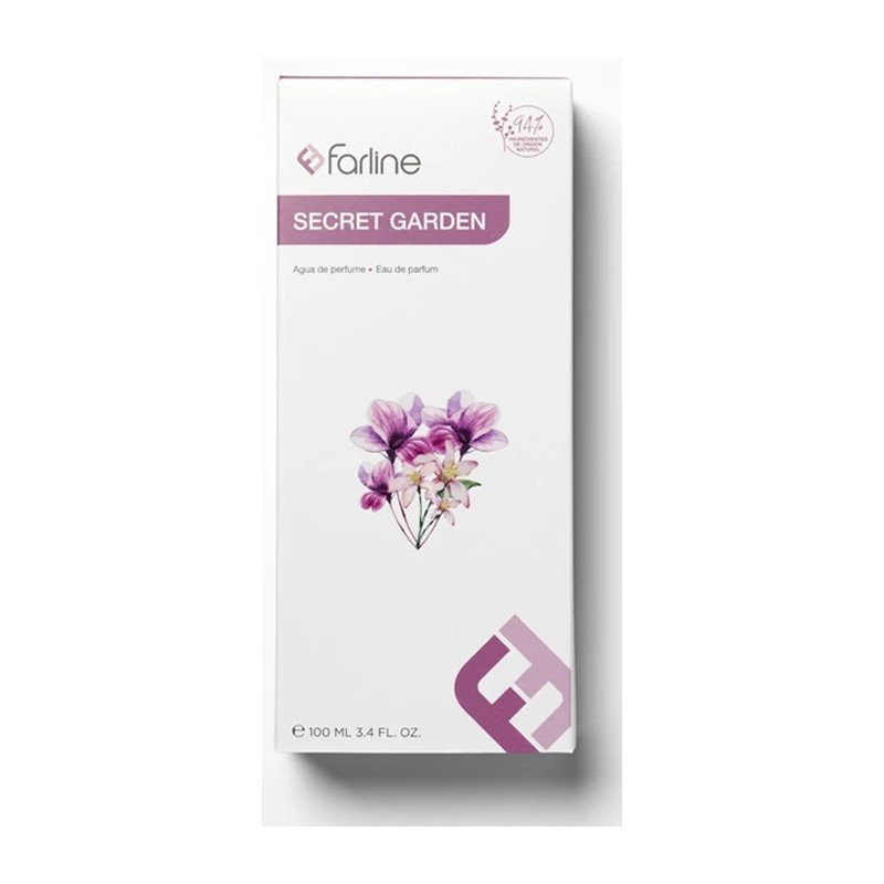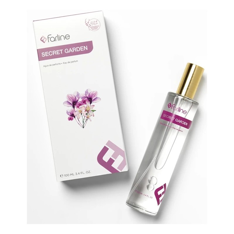 Farline Agua de Perfume Secret Garden es un perfume floral sofisticado con un 94% de ingredientes de origen natural. Destaca por su elegante aroma a higo, combinado con notas florales y un fondo de iris y musgo, ideal para un uso diario femenino y refinado.