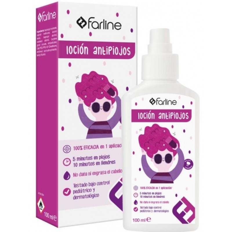 Farline Loción Antipiojos es un tratamiento pediculicida que elimina tanto piojos vivos como liendres (huevos) en una única aplicación.