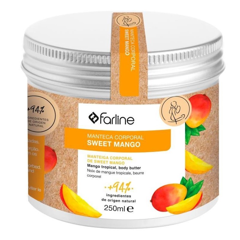 Farline Manteca Corporal Sweet Mango es una manteca corporal de textura cremosa y altamente nutritiva, diseñada para fundirse con la piel y proporcionar una hidratación intensa. Su fórmula contiene más de un 94% de ingredientes de origen natural, lo que garantiza un cuidado suave y efectivo para tu piel. Además, esta manteca corporal deja un delicioso perfume a frutas tropicales, específicamente mango, aportando una experiencia sensorial única. El envase de Farline Manteca Corporal Sweet Mango es 100% reciclable, contribuyendo al cuidado del medio ambiente.