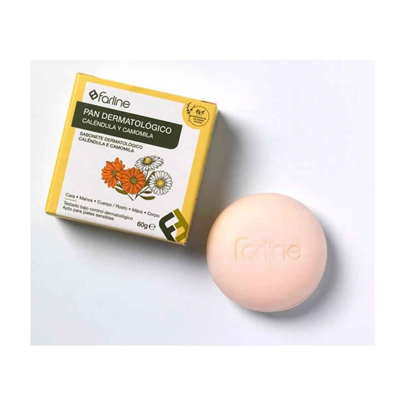 Farline Pan Dermatológico Camomila y Caléndula es un limpiador dermatológico sólido diseñado para el cuidado diario de la cara, cuerpo y manos.
