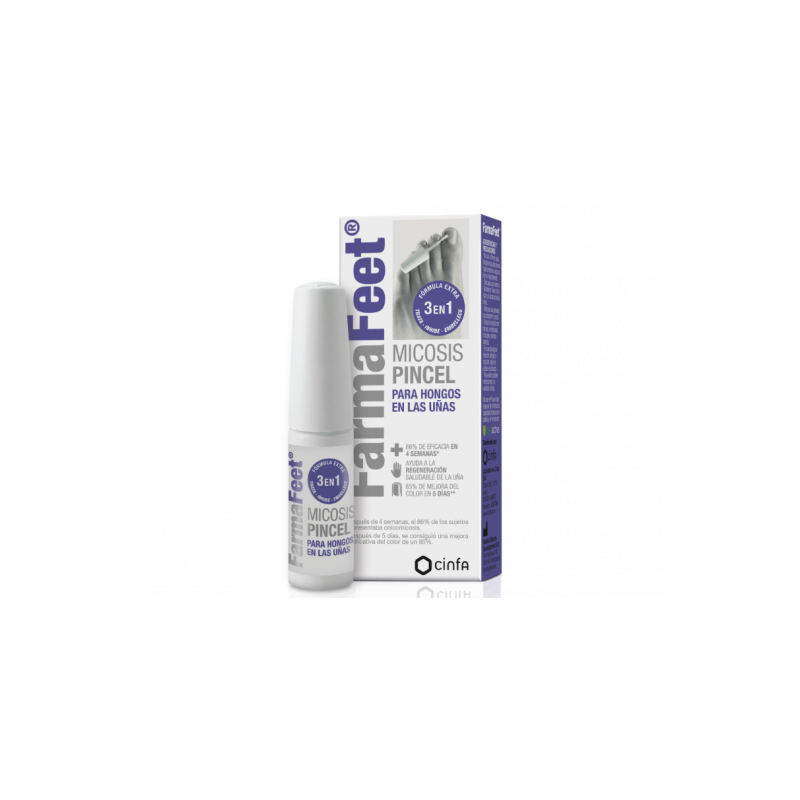 Con un formato práctico en pincel aplicador, FarmaFeet Micosis Pincel para Hongos en las Uñas 3 en 1 facilita una aplicación precisa y uniforme, llegando incluso al área bajo el borde de la uña, donde los hongos suelen proliferar. Este producto está clínicamente probado y ofrece resultados visibles en poco tiempo, convirtiéndolo en una opción de referencia para el cuidado antifúngico ungueal.