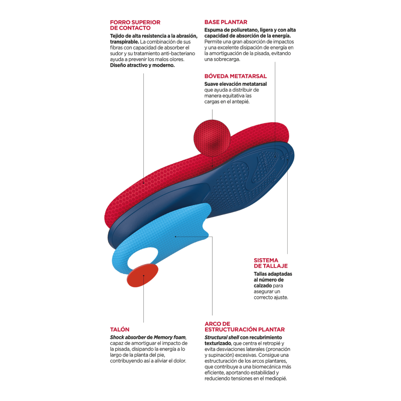 Colocar en sustitución de la plantilla original. Ajustar si es necesario. Introducir con la parte textil hacia arriba. Ventilar tras cada uso.