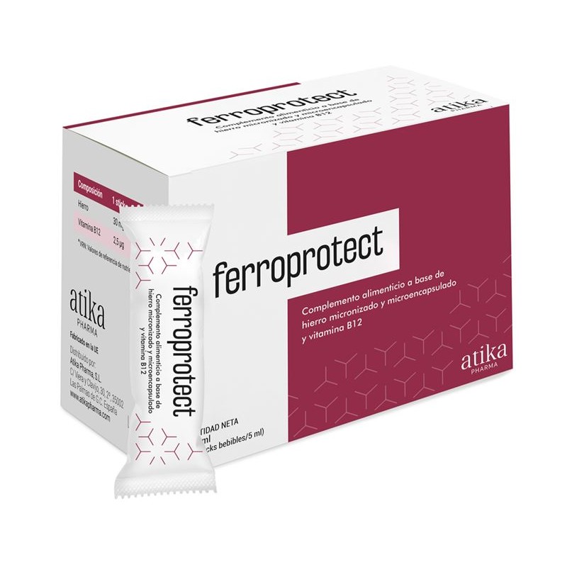 Ferroprotect es un complemento nutricional innovador diseñado para mejorar la eficacia y tolerancia del hierro. Gracias a su tecnología avanzada de micronizado y microencapsulado, este suplemento ofrece una excelente tolerancia gastrointestinal y una óptima absorción del hierro en el organismo. Además, su presentación en sticks bebibles lo hace práctico y fácil de tomar, incluso sin necesidad de agua.