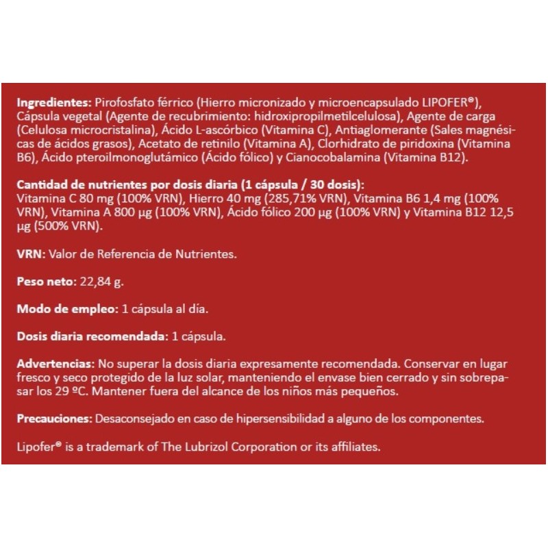 - Hierro (Pirofosfato de hierro LIPOFER®): 40 mg (285,71% VRN)