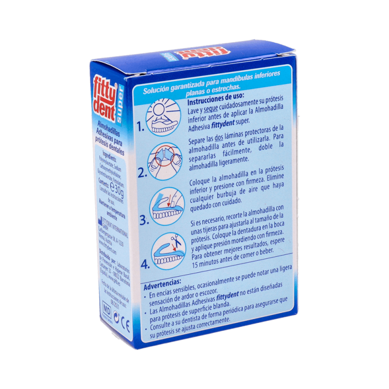 Este producto está indicado para portadores de prótesis dentales en la mandíbula inferior que buscan una solución eficaz para evitar el deslizamiento o desplazamiento de la prótesis. Las almohadillas de FITTYDENT proporcionan una mayor adherencia y estabilidad, especialmente en casos de encías inferiores planas o estrechas donde la fijación es un desafío.