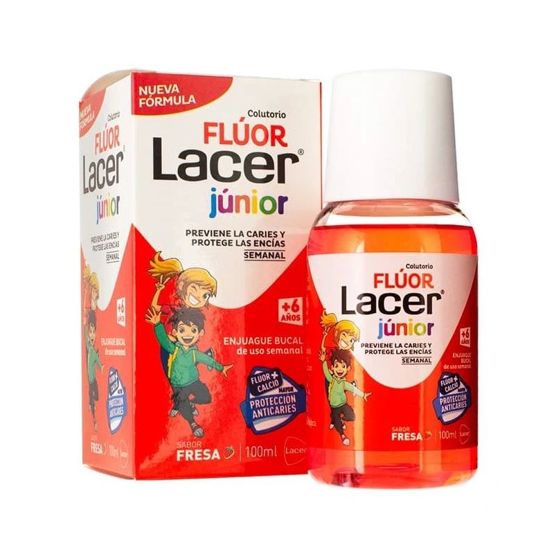 - Prevención eficaz de la caries: Fluor Lacer Junior Colutorio Semanal está formulado con 900 ppm de ion fluoruro, lo que ayuda a prevenir la caries dental reforzando el esmalte de los dientes en desarrollo.