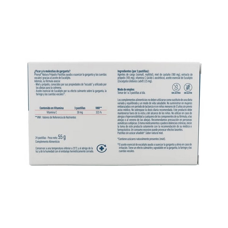 Phonal Própolis Pastillas Miel es un complemento alimenticio a base de propóleo, miel, esencia de eucalipto y vitamina C.