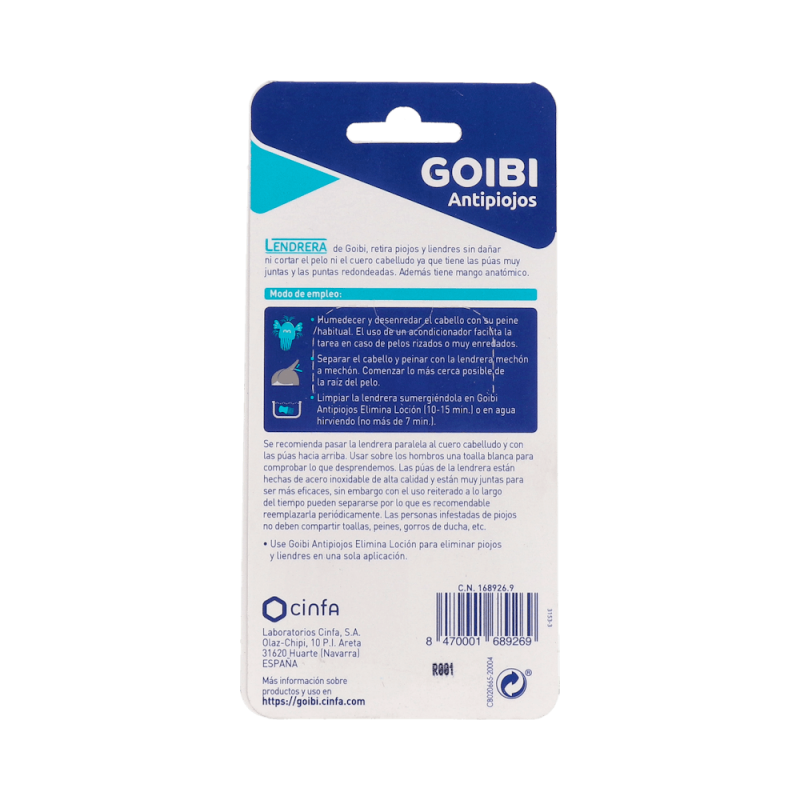 Goibi Lendrera es un peine diseñado específicamente para retirar piojos y liendres del cabello de manera eficaz, sin causar daño ni cortar el pelo ni el cuero cabelludo. Gracias a sus púas de acero inoxidable, juntas y redondeadas, es ideal para su uso en personas de todas las edades, incluso en bebés desde los 0 meses. Su mango anatómico garantiza comodidad durante su uso.