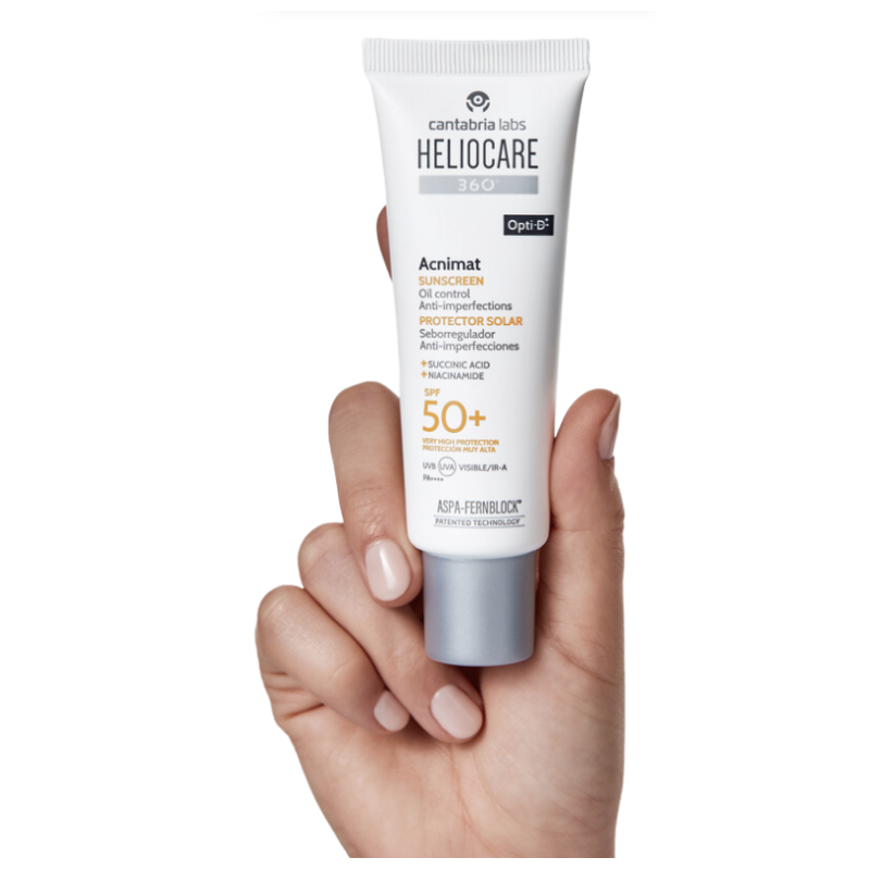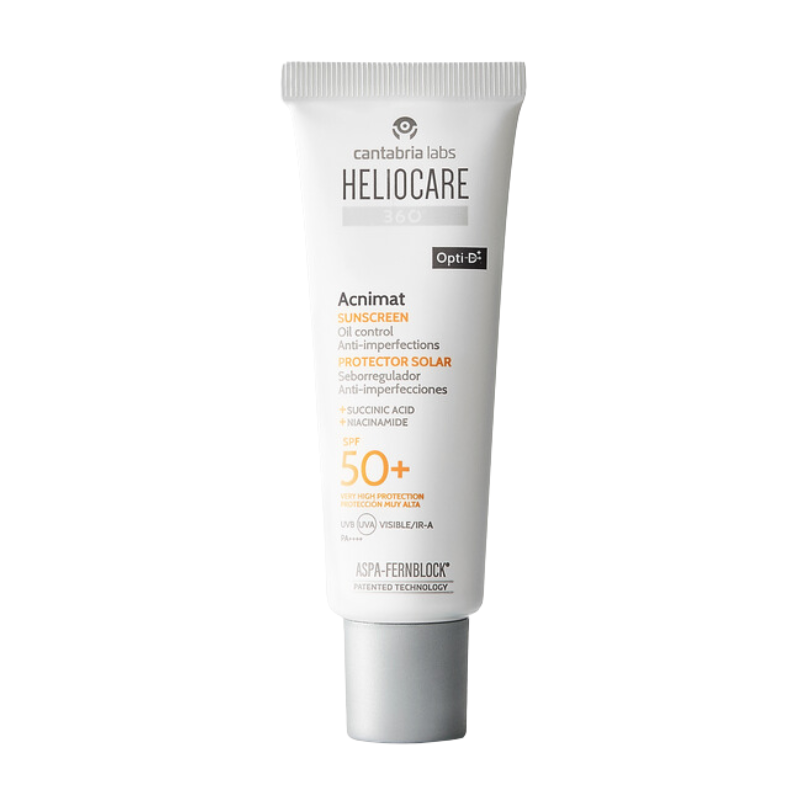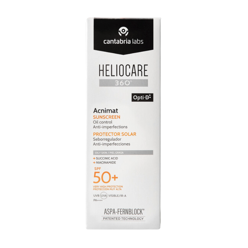 Heliocare 360º SPF 50+ Acnimat es un fotoprotector de muy alta protección solar, diseñado específicamente para pieles grasas con tendencia acneica. Su fórmula avanzada ofrece una cobertura de amplio espectro contra los rayos UVB, UVA, luz visible e infrarrojos.