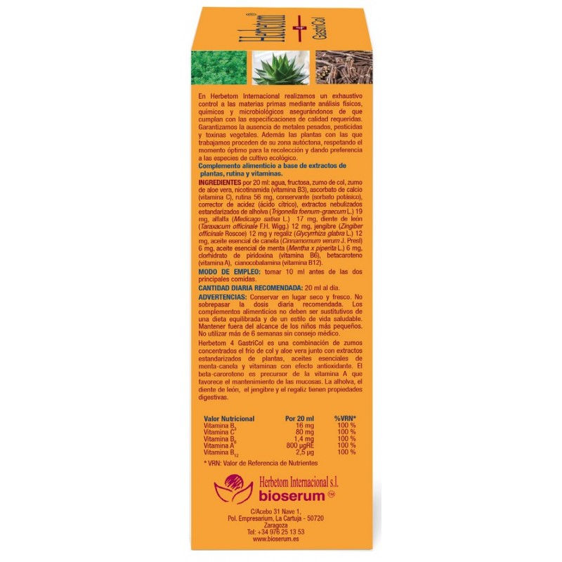 Herbetom 4 Gastricol Jarabe es un complemento alimenticio formulado a base de extractos naturales y vitaminas antioxidantes, especialmente diseñado para ofrecer confort digestivo a personas con digestiones sensibles o problemas gástricos recurrentes. Este jarabe combina zumos concentrados de col y aloe vera, junto a una mezcla única de plantas medicinales como alholva, alfalfa, diente de león y regaliz. Su fórmula ha sido enriquecida con vitaminas A, C, B3, B6 y B12, que aportan una potente acción antioxidante y ayudan a proteger los tejidos del sistema digestivo. Gracias a sus propiedades antiinflamatorias y calmantes, está indicado para aliviar síntomas comunes como ardor, acidez, náuseas, hinchazón o digestión pesada.