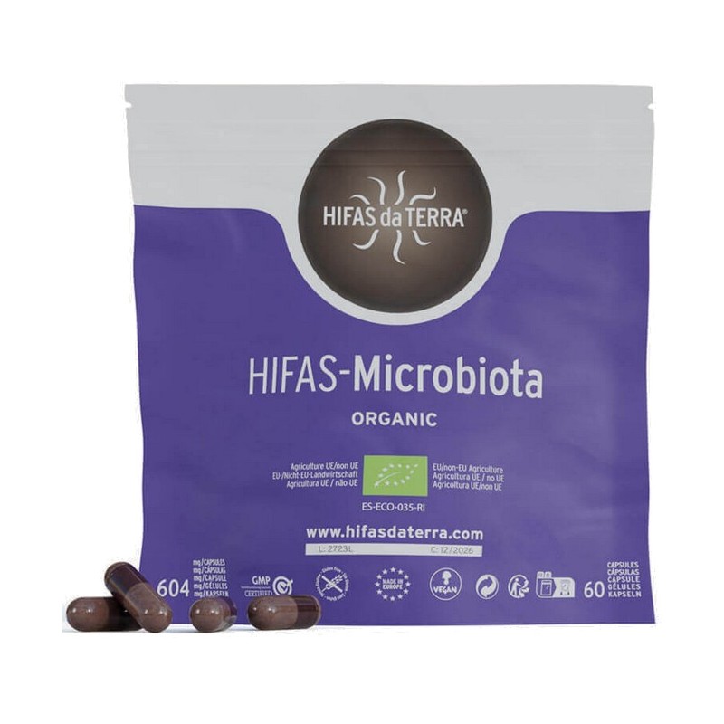 HIFAS da TERRA Hifas-Microbiota Doypack es un suplemento alimenticio en cápsulas diseñado para apoyar el equilibrio de la microbiota intestinal y promover un bienestar digestivo óptimo mediante el uso de prebióticos naturales procedentes de hongos ecológicos.