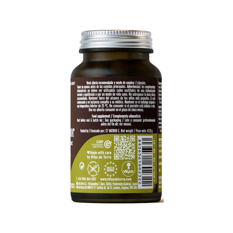 La dosis recomendada de HIFAS da TERRA Mico-Polypor es de 2 cápsulas al día, preferiblemente después del desayuno o de las comidas principales, acompañadas de un vaso de agua.