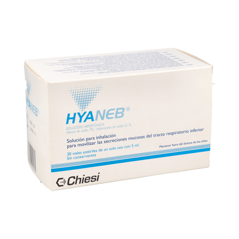 Hyaneb Inhalación Estéril es una solución hipertónica estéril diseñada para facilitar la movilización de secreciones mucosas en las vías respiratorias mediante un mecanismo físico osmótico. Su composición única, que incluye cloruro de sodio al 7% e hialuronato de sodio al 0,1%, la hace ideal para pacientes con afecciones respiratorias crónicas como fibrosis quística y bronquiectasias. Este producto es adecuado para su uso con cualquier nebulizador jet o de malla vibrante.