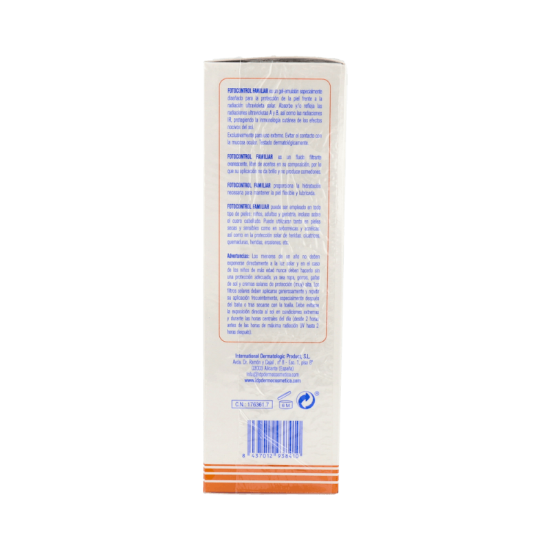 IDP MS Fotocontrol Familiar SPF50 es una innovadora emulsión fluida hidratante formulada para proporcionar una protección solar muy alta frente a los efectos perjudiciales de la radiación ultravioleta (UVA y UVB), así como de los rayos infrarrojos. Este fotoprotector está diseñado para proteger la piel de toda la familia, incluyendo niños, adultos y personas mayores, y es adecuado incluso para su aplicación sobre el cuero cabelludo.