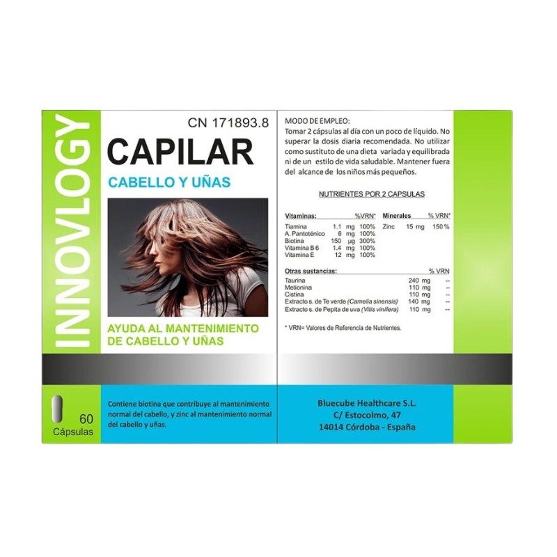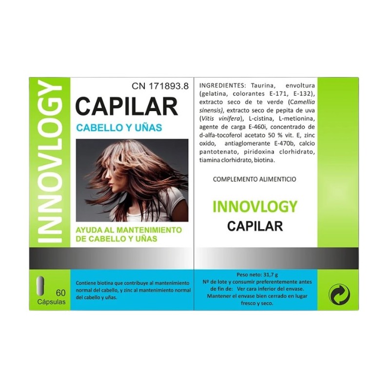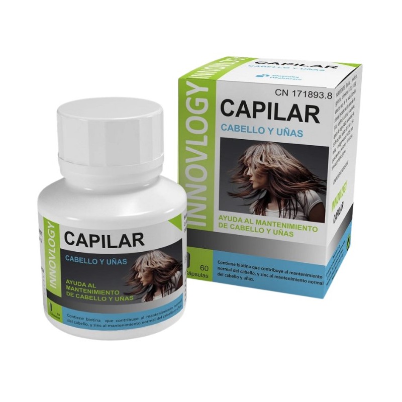 Innovlogy Capilar es un complemento alimenticio avanzado diseñado especialmente para el cuidado integral del cabello y las uñas. Su fórmula innovadora combina ingredientes esenciales que aportan los nutrientes necesarios para el desarrollo normal del cabello, ayudando a prevenir su caída y a promover un crecimiento más saludable, fuerte y brillante. Además de sus beneficios capilares, Innovlogy Capilar también contribuye al fortalecimiento y embellecimiento de las uñas, haciéndolas más resistentes y menos propensas a quebrarse.