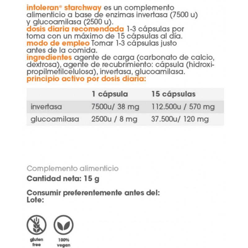 Intoleran Starchway es un complemento digestivo que combina las enzimas Glucoamilasa e Invertasa, diseñadas para ayudar a la digestión de carbohidratos complejos. La enzima Glucoamilasa facilita la digestión de almidones presentes en alimentos como cereales, patatas, pastas y productos procesados. La Invertasa, por su parte, ayuda a digerir la sacarosa o azúcar de mesa, presente en frutas como manzanas, plátanos, y en productos procesados con azúcar añadido.