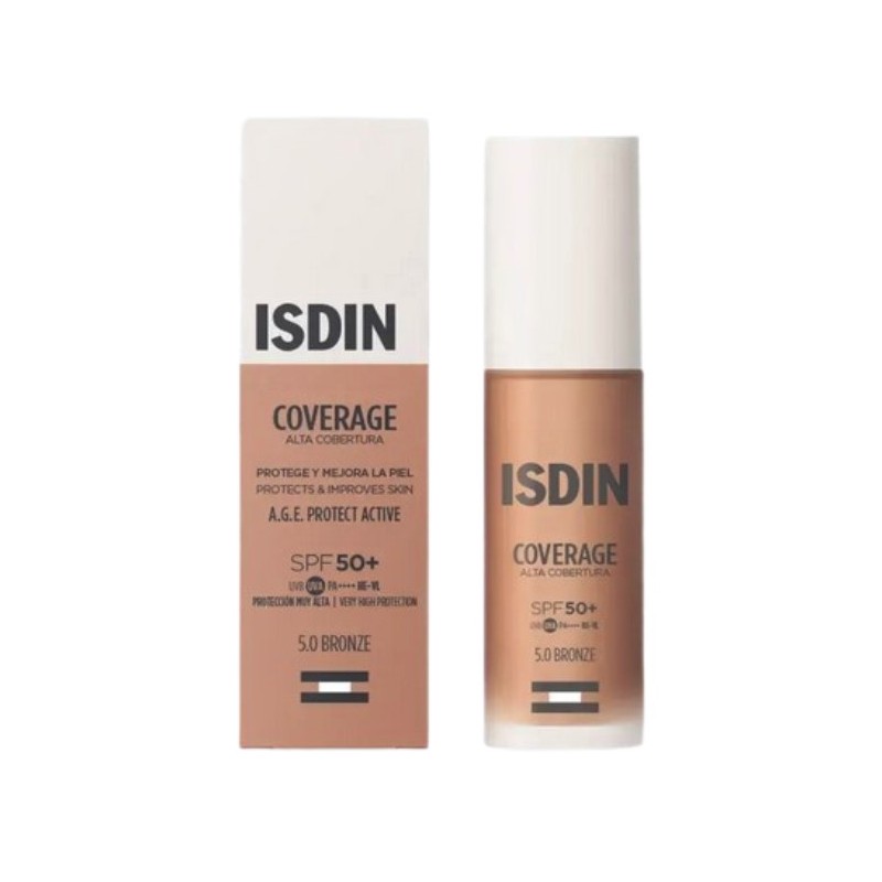 Isdin Coverage SPF 50+ 5.0 Bronze es una innovadora base de maquillaje con muy alta protección solar que combina cobertura impecable y cuidado avanzado de la piel.