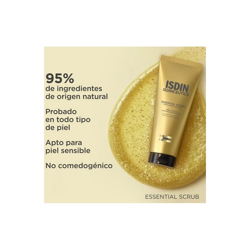 Isdin Limpiador Exfoliante Essential Scrub es un gel limpiador facial de uso diario formulado con un 95% de ingredientes de origen natural, que incorpora partículas exfoliantes suaves para limpiar profundamente y eliminar las células muertas de la piel.