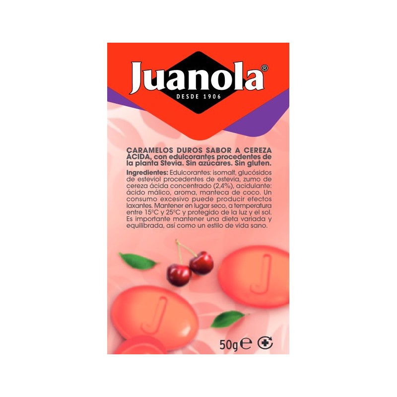 Juanola Caramelos Cereza son caramelos sin azúcar, elaborados con edulcorantes naturales como la stevia, y con el delicioso sabor típico de este fruto rojo. Vienen en una práctica presentación que permite llevarlos fácilmente en el bolsillo. Existen en cinco deliciosos sabores: limón, menta, cereza, fresa y naranja. Además, son aptos para personas con intolerancia al gluten.