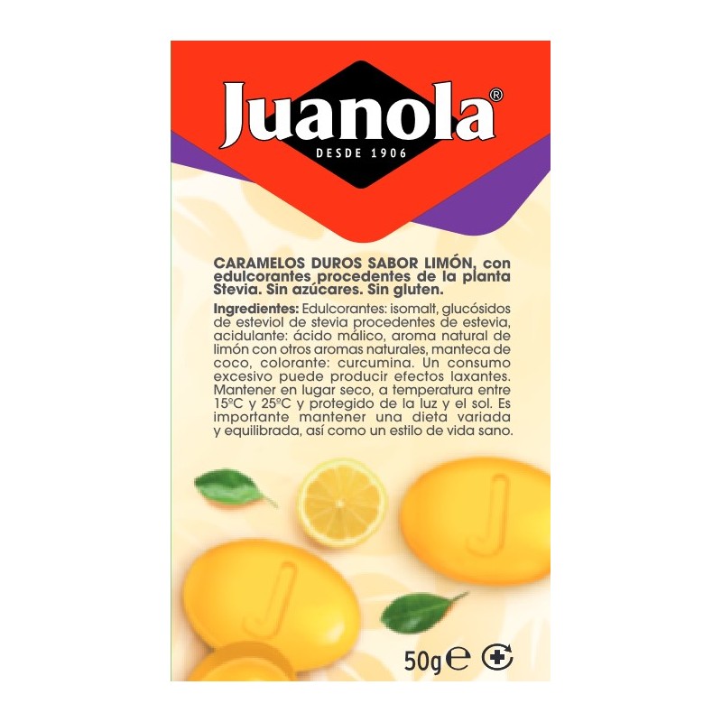 Juanola Caramelos Limón son caramelos sin azúcar, elaborados con edulcorantes naturales como la stevia y que ofrecen un agradable sabor cítrico. Vienen en una práctica presentación que permite llevarlos fácilmente en el bolsillo. Existen en cinco deliciosos sabores: limón, menta, cereza, fresa y naranja. Además, son aptos para personas con intolerancia al gluten.