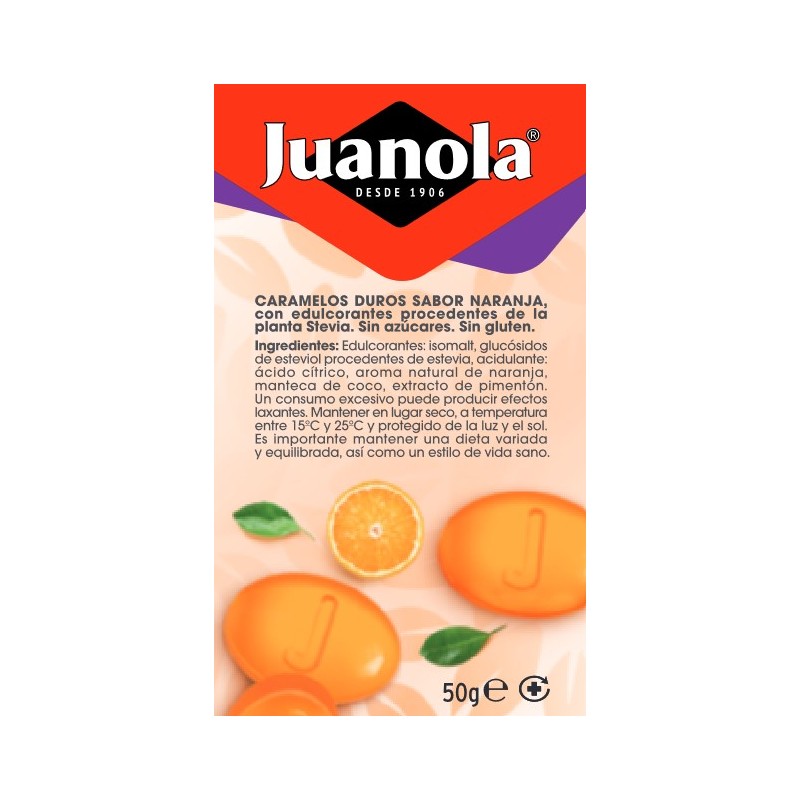 Juanola Caramelos Naranja son caramelos sin azúcar, elaborados con edulcorantes naturales como la stevia y con un delicioso sabor cítrico. Vienen en una práctica presentación que permite llevarlos fácilmente en el bolsillo. Existen en cinco deliciosos sabores: limón, menta, cereza, fresa y naranja. Además, son aptos para personas con intolerancia al gluten.