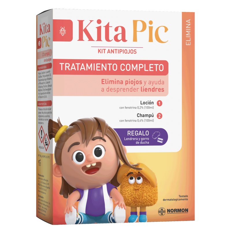 KitaPic Kit Antipiojos Tratamiento Completo es un tratamiento eficaz y testado dermatológicamente para eliminar los piojos y liendres. El kit incluye una loción y un champú pediculicida con fenotrina como principio activo, que actúa directamente sobre las células nerviosas de los piojos, bloqueando la transmisión del impulso nervioso y provocando la parálisis y muerte del piojo. Además, el kit incluye una lendrera y un gorro de ducha para facilitar el proceso de tratamiento.