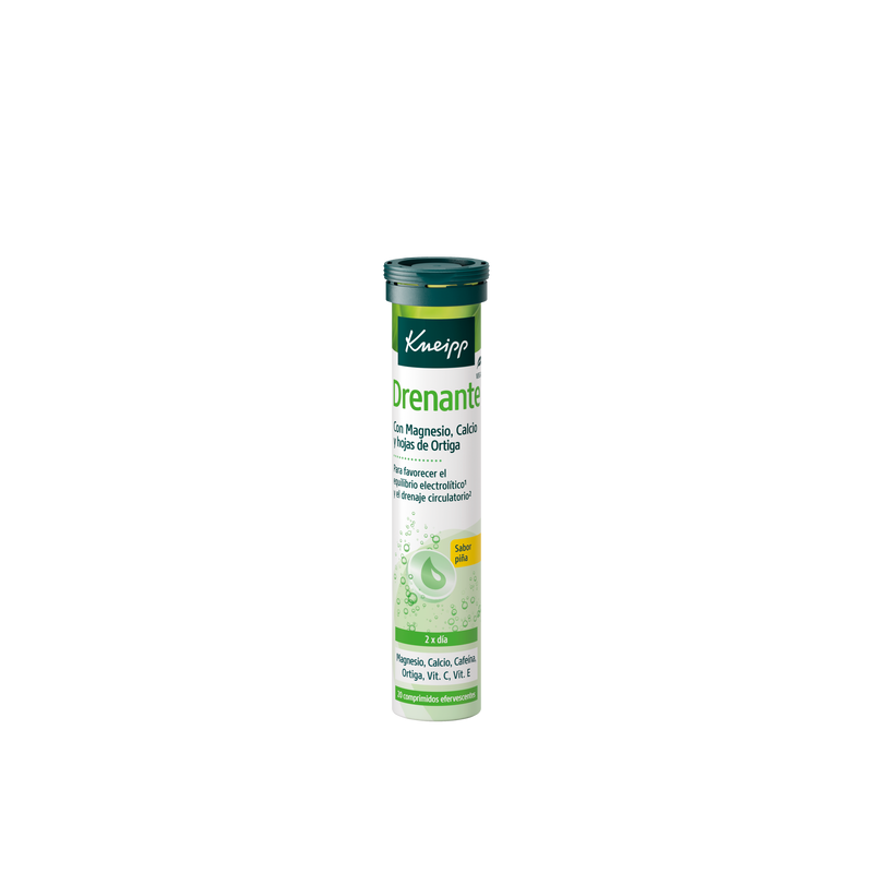 Kneipp Drenante es un complemento alimenticio que contribuye al equilibrio electrolítico y promueve el bienestar circulatorio. Su fórmula con magnesio, calcio, vitamina C, vitamina E, cafeína y extracto de hojas de ortiga ayuda a mantener una circulación sanguínea saludable y a reducir la sensación de piernas cansadas.