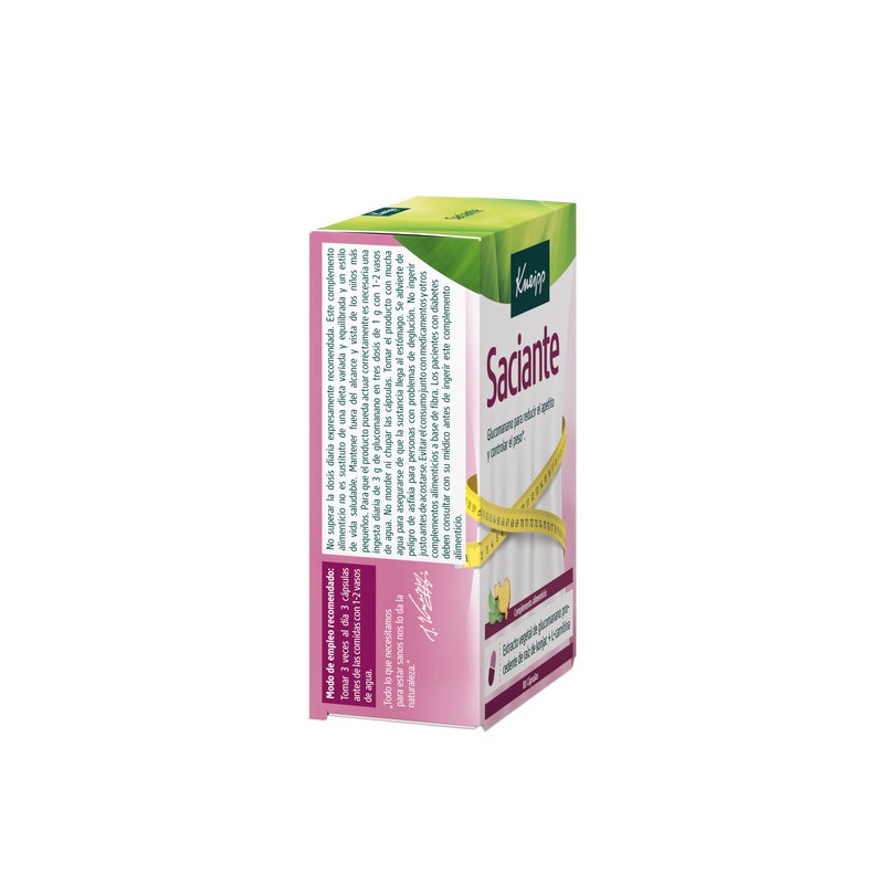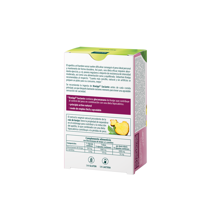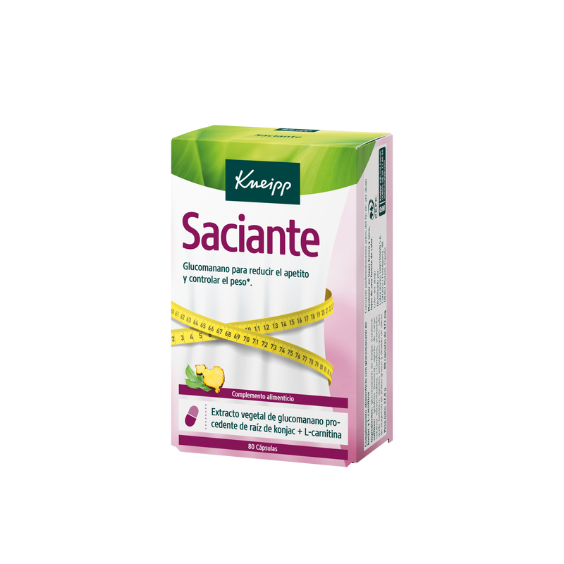 Kneipp Saciante es un complemento alimenticio formulado para ayudar a reducir el apetito y contribuir al control del peso. Su ingrediente principal es el glucomanano de Konjac, una fibra vegetal con propiedades beneficiosas para la pérdida de peso y la salud cardiovascular.