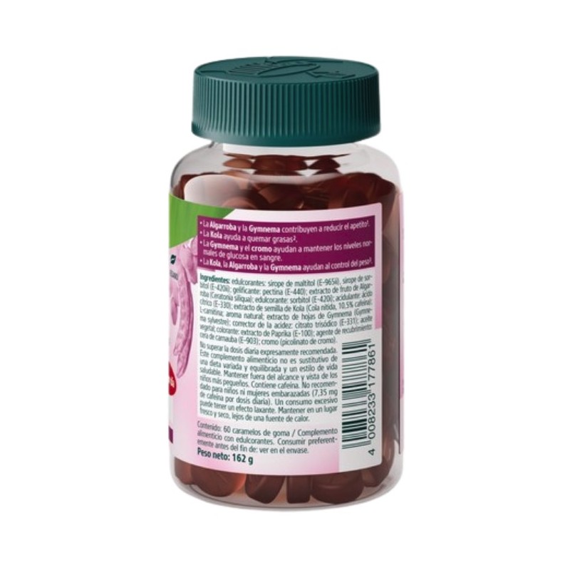 Ingredientes principales: Algarroba, Gymnema, Kola y Cromo. No contiene azúcares añadidos, gluten ni lactosa.