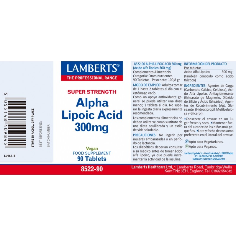 Lamberts Ácido Alfa Lipoico es un potente suplemento antioxidante formulado con 300 mg de ácido alfa lipoico por tableta, un nutriente clave conocido por su capacidad para combatir el estrés oxidativo y apoyar la salud celular desde el interior.