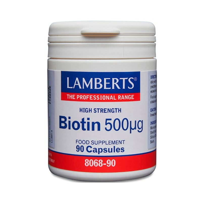Lamberts Biotina es un complemento alimenticio esencial para la salud del cabello, la piel y las uñas, formulado con una alta concentración de biotina (500 µg por cápsula), también conocida como vitamina B7.