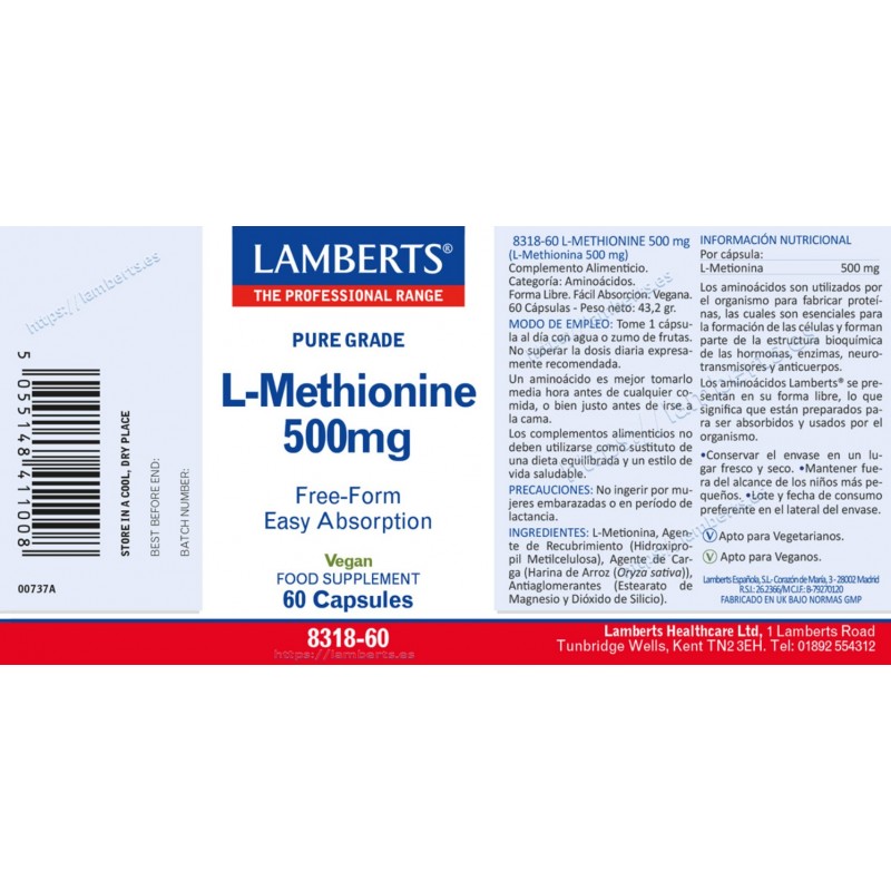 La L-metionina no puede ser sintetizada por el cuerpo humano, por lo que debe obtenerse a través de la dieta o la suplementación. Aunque se encuentra en alimentos como carnes, pescados, huevos o frutos secos, su aporte puede ser limitado en dietas vegetarianas o veganas, lo que convierte a Lamberts L-Metionina en una excelente opción para complementar la nutrición diaria.