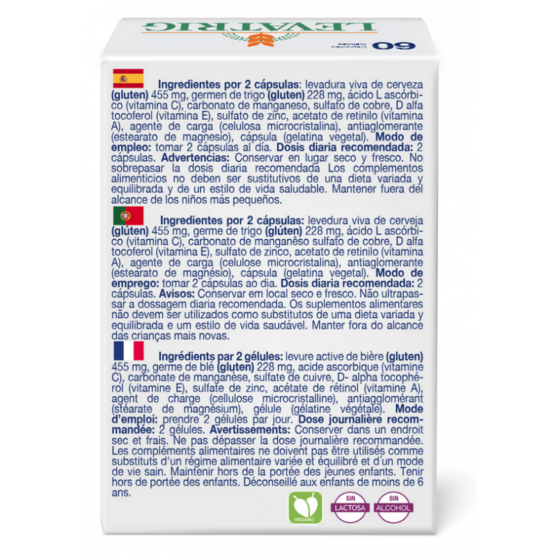 Levatrig Cápsulas es un complemento alimenticio diseñado para contribuir al buen mantenimiento de la piel, cabello y uñas. Formulado con levadura viva de cerveza y germen de trigo, dos ingredientes naturales ricos en proteínas y aminoácidos esenciales que ayudan a fortalecer y proteger las estructuras que conforman la piel y anexos.