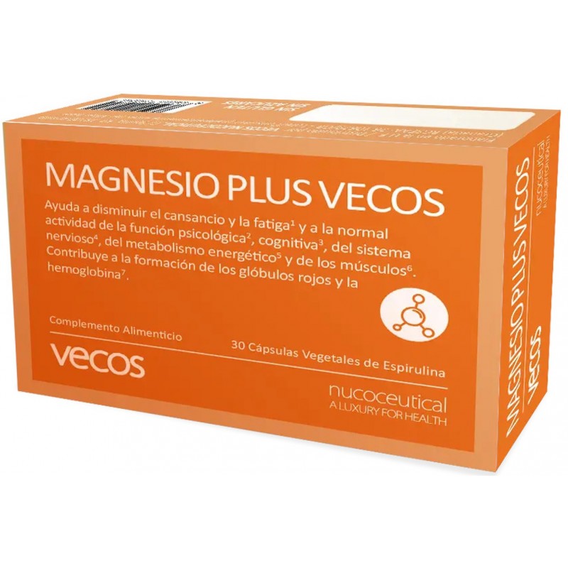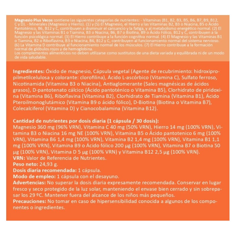 Magnesio Plus Vecos es un complemento alimenticio innovador en cápsulas diseñado para ser el aliado perfecto en tu día a día. Su exclusiva fórmula combina Magnesio, Vitaminas del grupo B, Vitamina C, Vitamina D y Hierro, logrando una sinergia única para contribuir al metabolismo energético normal, al funcionamiento del sistema inmunitario y al equilibrio de la función psicológica y cognitiva. Además, es un producto sin gluten, sin lactosa y totalmente vegano, ideal para quienes buscan un suplemento natural, eficaz y compatible con cualquier estilo de vida saludable.