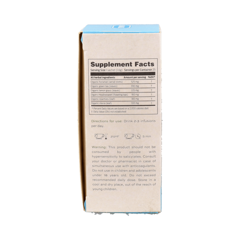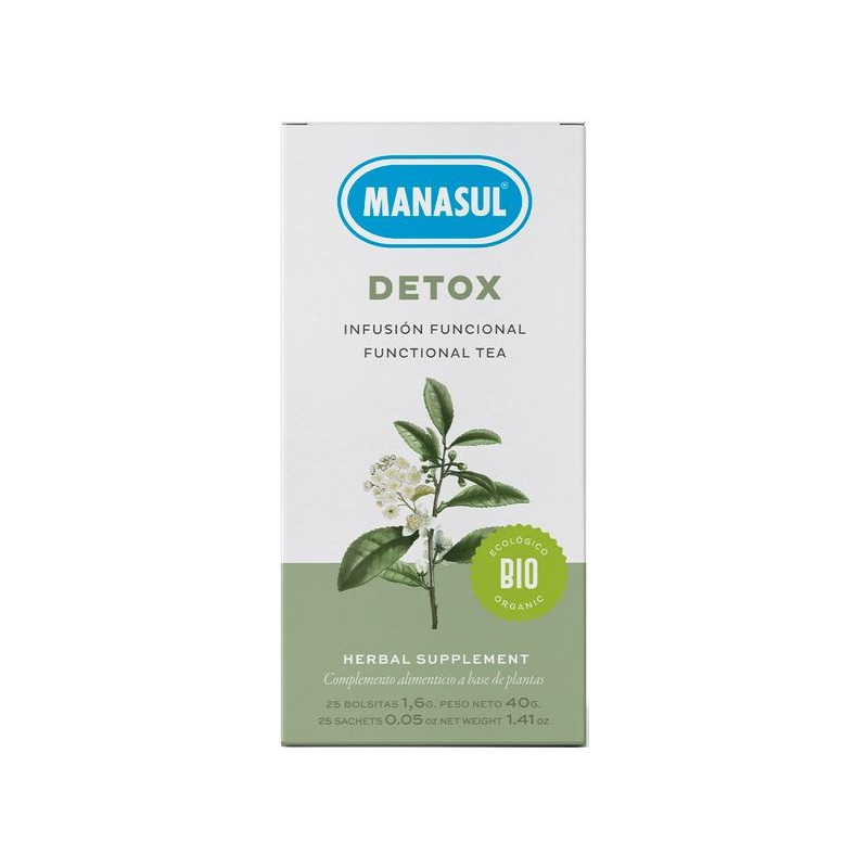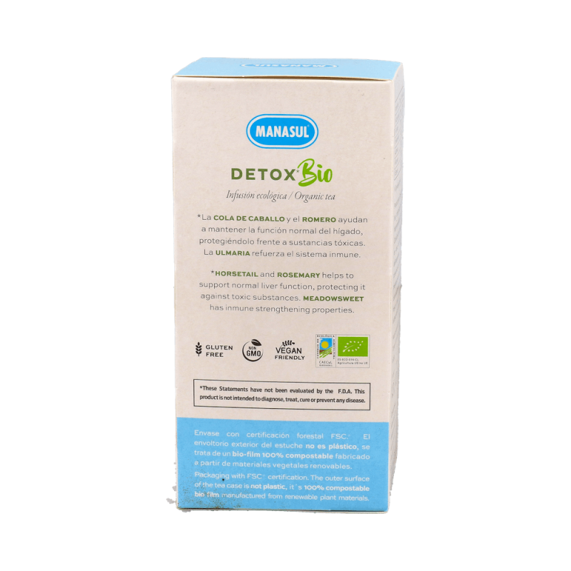 Manasul DETOX Bio es una infusión natural elaborada con té verde, romero, cola de caballo y ulmaria, ingredientes con propiedades antioxidantes y depurativas que contribuyen a la eliminación de toxinas del organismo.