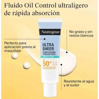 Neutrogena Sun Fluido Invisible Oil Control SPF50 es un protector solar facial SPF50 para piel grasa y mixta que protege frente a rayos UVA y UVB mientras controla el brillo. Su textura ligera ofrece un acabado mate e...
