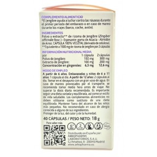 Arkocápsulas Jengibre (Zingiber officinale) es un complemento alimenticio especialmente diseñado para las personas que desean mejorar su digestión o que quieren evitar el malestar debido al mareo cinético.