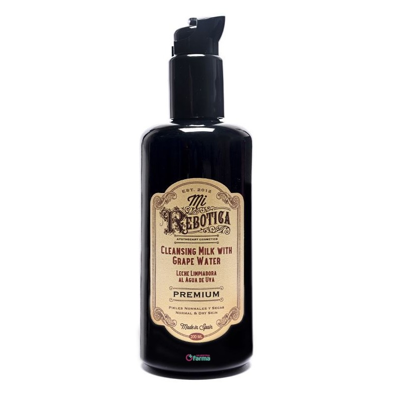 La Leche limpiadora al Agua de Uva de Mi Rebotica es rica en agua de uva y aloe vera para la higiene facial diaria sin agua de pieles normales y secas. Apta para pieles sensibles.