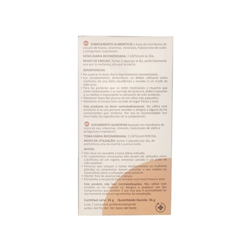 Este potente complemento nutricional actúa desde el interior del organismo para estimular la producción natural de colágeno y reducir su degradación, contribuyendo así a mantener la estructura, firmeza y juventud de la piel. Además, promueve el fortalecimiento del cabello y las uñas, gracias a su composición rica en proteínas estructurales fundamentales para la regeneración celular y la elasticidad.