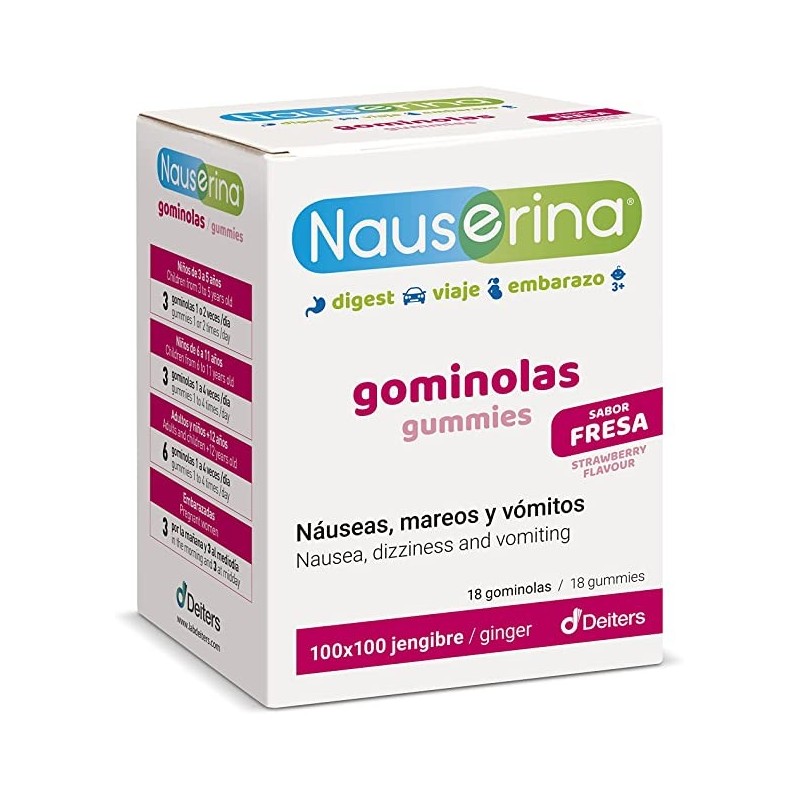 Nauserina gominolas es un complemento alimenticio a base de extracto de jengibre, que ayuda a prevenir y reducir la sensación de naúseas, mareos y vómitos, asociado a la digestión, viajes o embarazo.