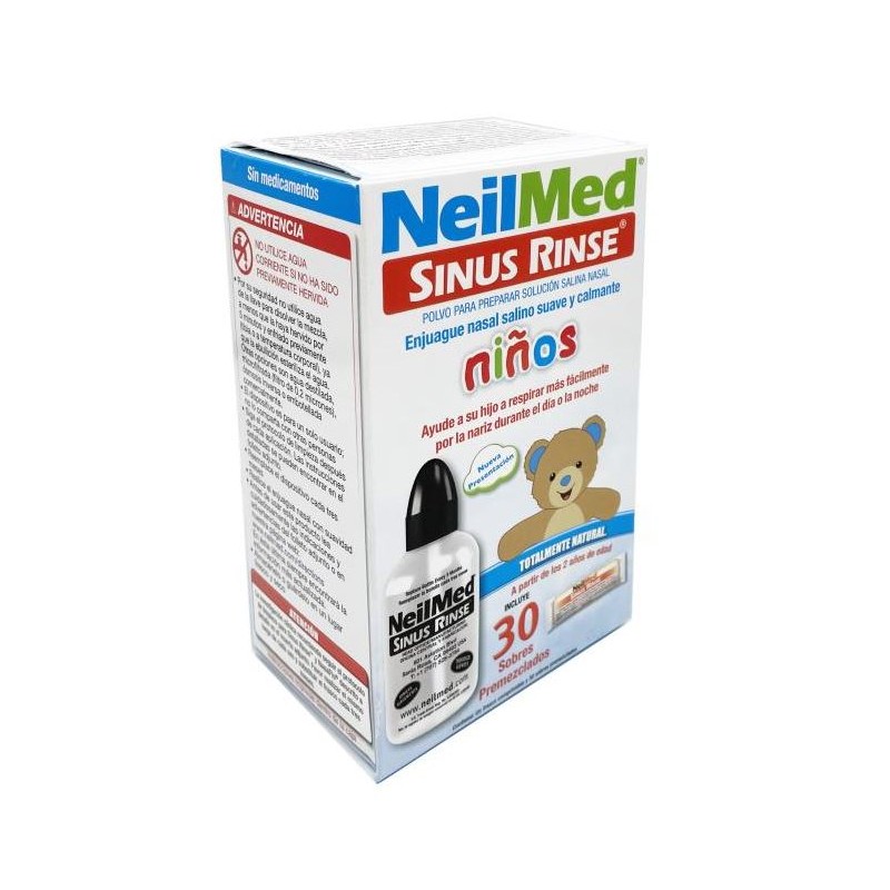NeilMed SINUS RINSE Niños es un polvo para preparar solución salina nasal especialmente formulado para niños a partir de los dos años de edad. Este producto ha sido diseñado para realizar un enjuague nasal salino suave y calmante, ayudando a limpiar las fosas nasales de forma segura, natural y eficaz.