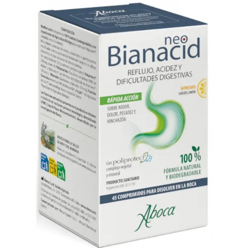 NeoBianacid Acidez, Reflujo y Dificultades Digestivas sabor limón está indicado en el tratamiento de los trastornos relacionados con la acidez, como ardor, dolor, reflujo gastroesofágico y gastritis.